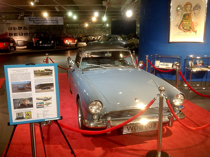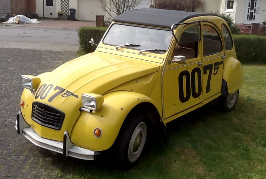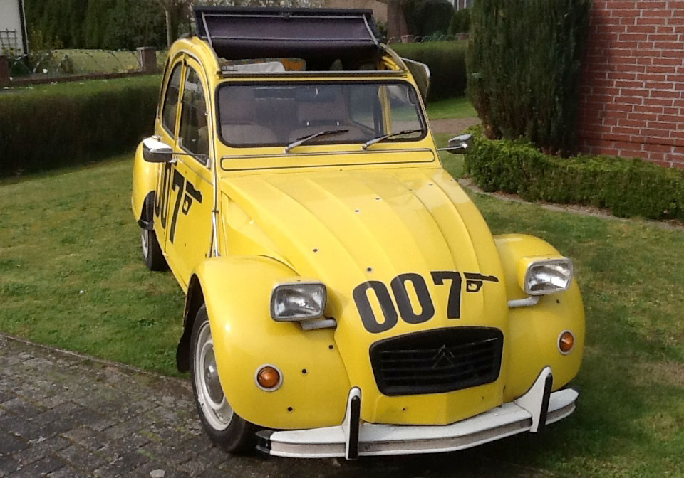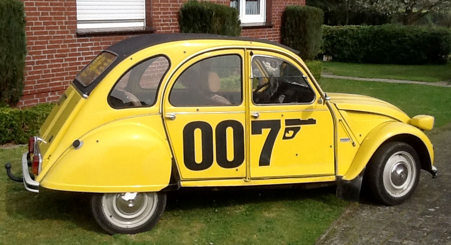 - Eine gelbe 007 Ente (Citroen 2 CV), entspricht dem Fahrzeug aus dem Film „In tödlicher Mission“ (1981). Eines von nur 1.000 Sondermodellen mit 007 Schriftzügen.