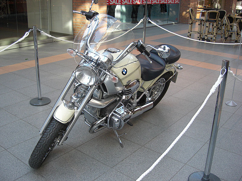 - Ein beigefarbenes Motorrad vom Typ BMW r1200c (baugleich zu dem im Film „Der Morgen stirbt nie“, 1997)